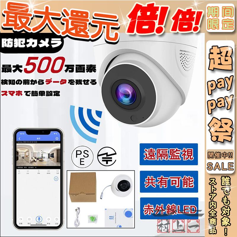 防犯カメラ ドーム型 最大500万画素 家庭用 屋外 屋内 首振リ 監視カメラ IPカメラ Wi-Fi ネットワーク ネット環境なし SDカード録画 IP66 遠隔監視