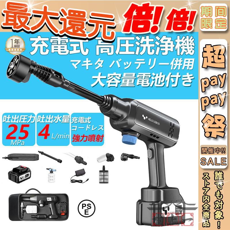 高圧洗浄機 コードレス 充電式 家庭用 バッテリー付き マキタ バッテリー併用 最大吐出圧力4MPa 自吸式 洗車 軽量 5つのギアモード 高圧洗車機 小型 PSE認証