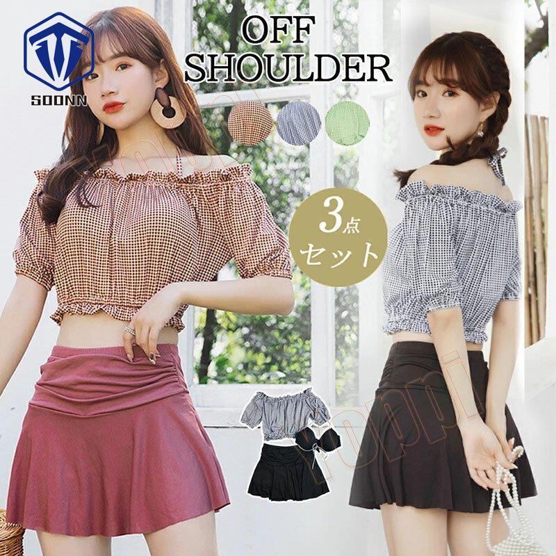 水着 レディース バンドゥ ビキニ キャミソール スカート 3点セット 水着 体型カバー 中学生 高校生 女の子 オフショルダー ハイウエスト ママ水着YY056830f9a0