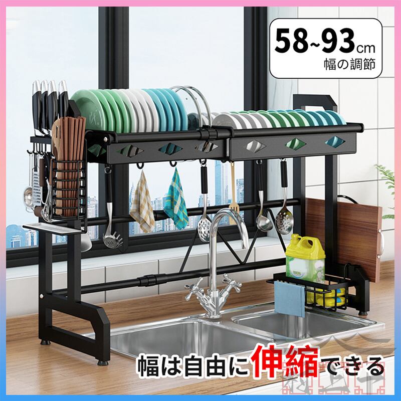 水切りラック シンク上 伸縮式 1段 | 水切りラック シンク上 炭素鋼製 水切りかご シンク渡し シンク横 キッチン キッチン収納 まな板立て 箸立て 水切り ラック 付属品も充実!