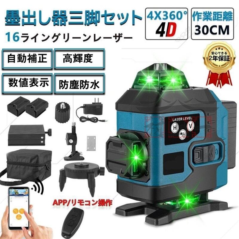 レーザー墨出し器 水平器 4x360°グリーンレーザー 16ライン 輝度調整可能 25メートル作業範囲 レーザーレベル 自動補正 360°回転台 屋内屋外兼用 IP65 防塵防水