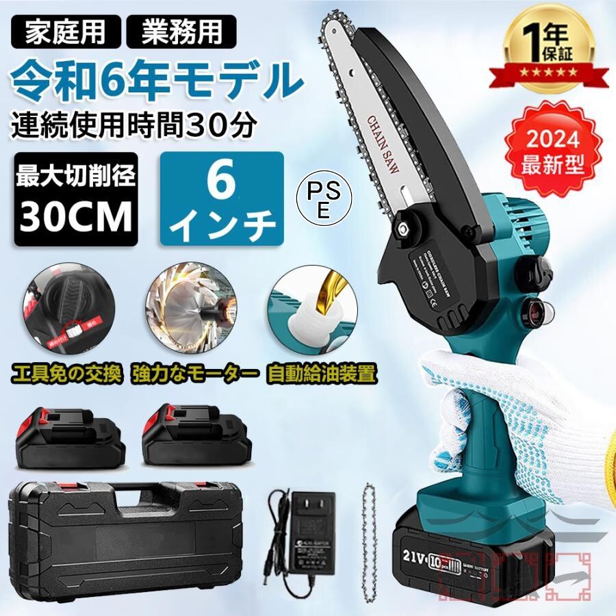 チェーンソー 充電式 6インチ マキタ バッテリー互換 自動給油 電動ノコギリ 小型 コードレス 強力 片手 軽量 切段物径20cm 木工切断 枝切り 伐採 薪作り 農業