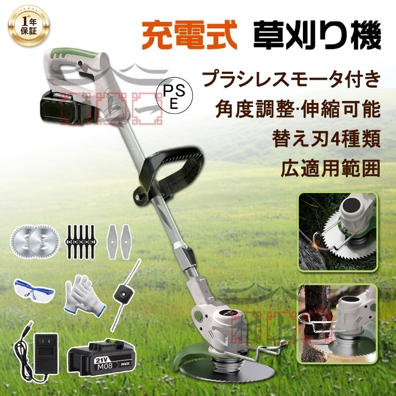 草刈機 充電式 コードレス バッテリー付き マキタ互換 軽量 草刈り機 電動 強力 芝刈機 除草 コスパ抜群 替え刃4種類 伸縮式 角度調整 枝切り 雑草 屋外 家庭用